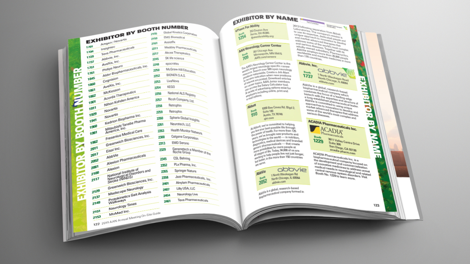 Once the Science Book was complete, two more publications remained: the On-site Guide and the Room Locator Guide. These two publications were more compact, narrowed down versions of their predecessors. They provided a more specific schedule and general guide to the Annual Meeting facility, as they were meant to be more handheld versions of the Early Look and Science Books.